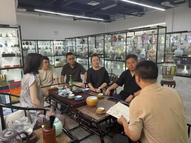 走访期间,方漫一行首先来到端隆非遗制瓷基地。该企业在陶瓷领域深耕多年,拥有丰富的行业经验和深厚的文化底蕴。企业负责人冯启铭详细介绍了企业发展历程、业务范围、产品特色以及企业文化等方面的情况。方漫系统介绍了艺术学院办学概况、学生实习实训、课程体系以及毕业生的专业技能与综合素养等情况,他指出,专业实习是学生认知职场生态、融入企业文化的重要路径,对提升就业竞争力具有关键作用。双方就学生毕业创作入驻地学习及生活保障等细节展开深入交流,通过引入企业项目,优化课程体系,整合双方资源,为学生提供更多实践机会与平台,促进人才培养质量和就业双提升。