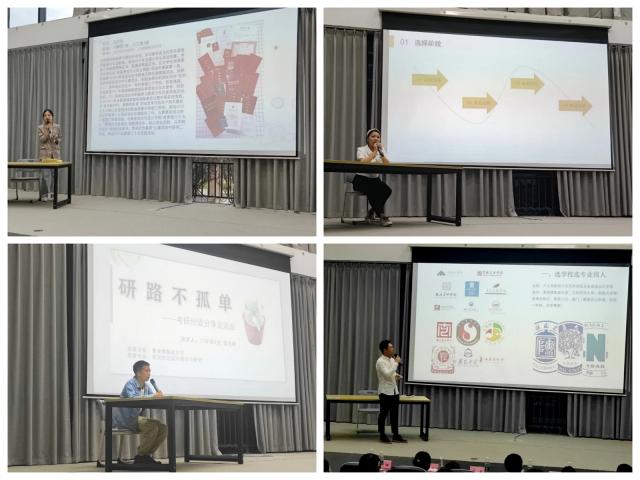 会议上邀请了马兆银、周坤、伍佳鹏、胡耀瑶四位考研通过的学长学姐介绍了近年来考研基本情况和考研科目、提供相关搜寻报考院校信息的途径,并根据自身学习经历分享了考研经验。