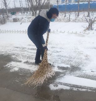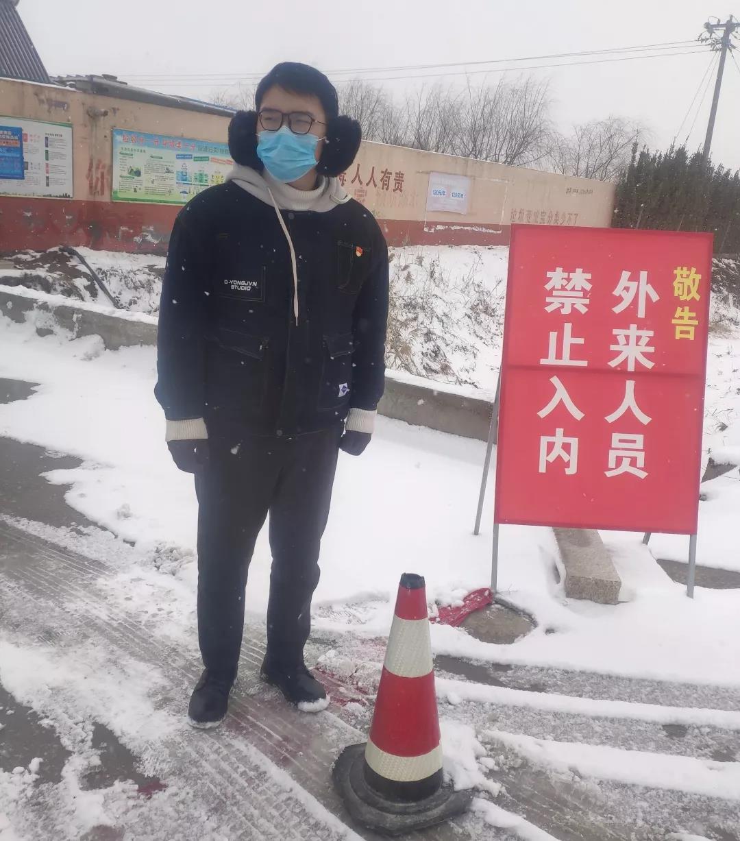 王艺霖同学主要负责每天下午对外来进村人员进行劝返,为进出村民们体温测量,耐心劝导村民出门戴口罩,并向村民分发消毒液进行自主消毒。他密切关注村民言行和心理状况,及时辟谣,与有恐慌情绪的村民聊天进行心理引导等。他在大雪天无惧严寒,坚守值班岗位,与父亲一起为村主路清扫积雪。