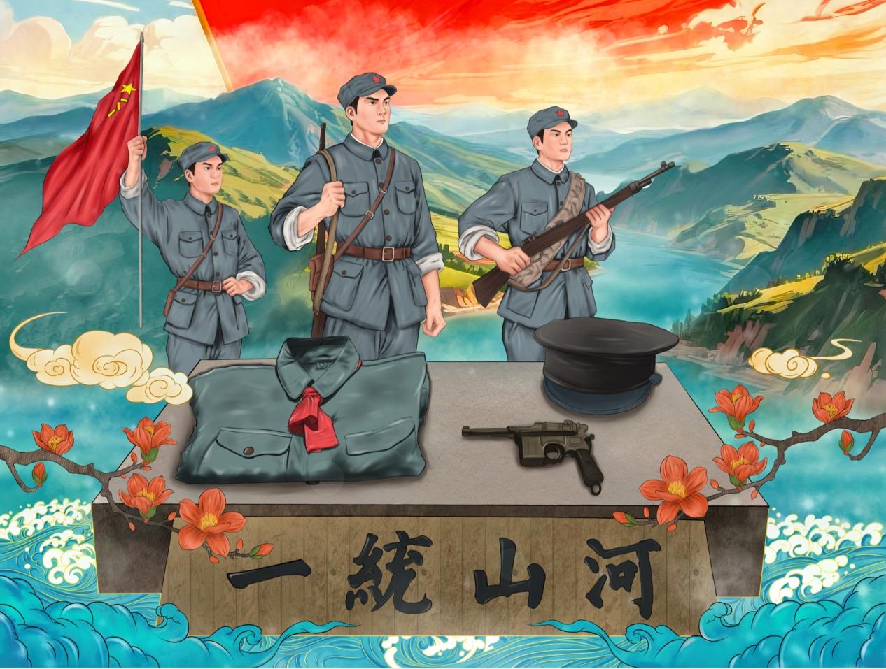 这幅作品以南昌八一起义纪念馆的馆藏文物为核心创作元素,通过艺术化的视觉语言,再现那段开天辟地的革命历史,让观众在图像的冲击中触摸红色藏品的温度,感悟先辈们为“一统山河”的理想而浴血奋战的初心。