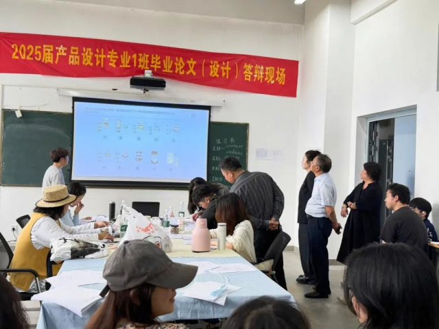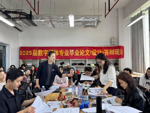 陶瓷美术与设计艺术学院党委书记陈后辉,院长张博,党委副书记、纪委书记胡文毅,副院长程幸、朱希睿一行深入2025届本科毕业答辩现场,听取答辩流程介绍,观察学生临场表现,并与评审教师就学术规范、评分标准、成果创新性等展开交流。24个答辩组教师从选题价值、文献综述深度、研究逻辑、实践应用及格式规范等方面进行综合评分,针对部分论文存在的文献引用疏漏、研究方法单一等问题,专家提出“强化理论支撑”“增加调研数据”等针对性建议,并强调学术诚信与创作原创性为答辩核心底线。