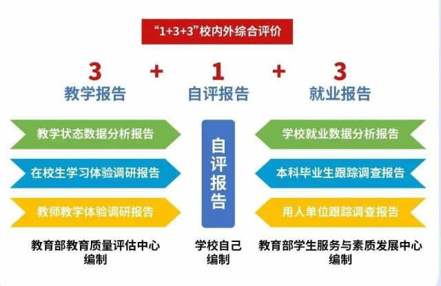 以《自评报告》为主体、《本科教学状态数据分析报告》《在院生学习体验调查报告》《教师教学体验调查报告》3份过程性报告和《本科生就业数据分析报告》《本科毕业生跟踪调查报告》《用人单位跟踪调查报告》3份结果性报告为两翼的1+3+3多维立体评价体系,真正体现以学生为中心理念,引导学院促进教师投入教学。