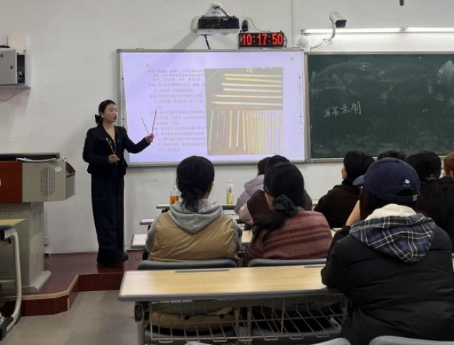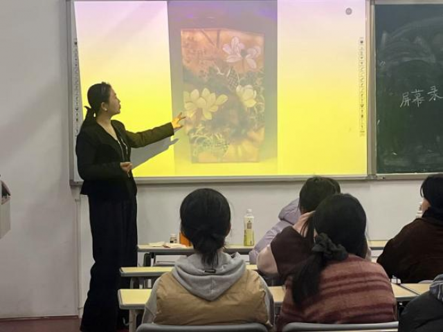 在授课过程中,徐冰老师积极与学生互动,通过提问等方式激发学生的学习兴趣,引导学生思考古彩装饰在现代艺术中的应用价值,鼓励学生勇于尝试,将传统古彩装饰与现代审美相结合,创作出具有个人特色的作品。