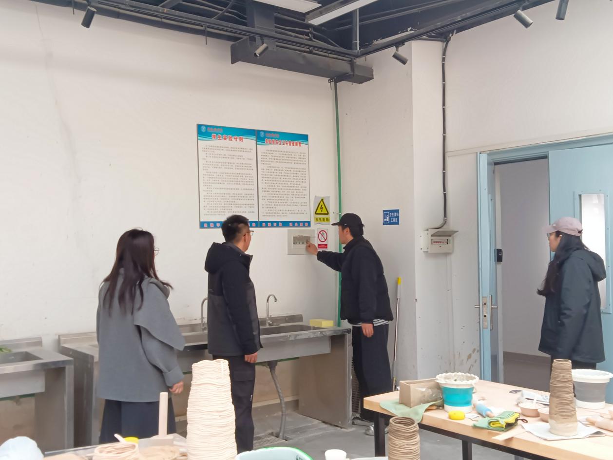 针对窑房、木工、机房、3D打印、喷绘、陶瓷实训室等开展了全面的燃气及用电安全专项排查行动,旨在构建“人防+技防”双重安全保障体系,切实保障实训室假期安全。在窑房检查中,重点核查了窑炉设备完好状态、有效使用期限及燃气软管老化情况,并测试燃气报警装置及联动切断阀的安装规范性与运行有效性。同时,对电烤花炉开关、温度表指示准确性进行逐项核查,进一步优化了设备及物品摆放秩序,消除潜在安全隐患。针对计算机、3D打印、VR实训室用电安全,本次检查聚焦设备密集区电气安全全流程管控,实施拉网式排查电源线路老化程度、绝缘层完整性及接线端子紧固情况,杜绝因线路破损、接触不良引发的短路风险。