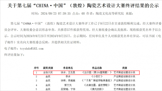 (本网讯:图|来源于网络 文|王思怡)为贯彻落实习近平文化思想,推动陶瓷艺术与文化创意相结合,创意设计向文创产品再转化,实现共同发展、共兴共荣的行业盛况,由中国建筑卫生陶瓷协会、景德镇陶瓷大学、敦煌市人民政府联合举办第七届“CHINA·中国”(敦煌)陶瓷艺术设计大赛中,景德镇学院陶瓷美术与设计艺术学院教师徐冰作品《出行图(第156窟南壁)》(与青年陶艺家王志昊合作完成)脱颖而出,获艺术陶瓷创意设计类“全场大奖”。