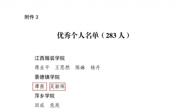 近日,共青团江西省委等四部门对2024年江西省大中专学生志愿者暑期“三下乡”社会实践活动结果公示,对2024年“三下乡”社会实践活动中表现突出的优秀集体、个人和项目进行表扬。其中,艺术学院辅导员老师 谭茜 艺术学院青年教师吴颖琛老师荣获江西省“三下乡”社会实践优秀个人荣誉称号。