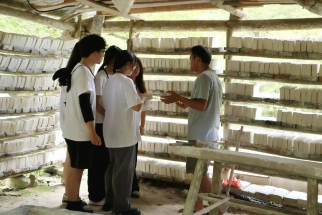 实践团来到瑶里镇绕南村,深入到当地的水碓使用现场,亲眼见证了这一传统工艺的奇妙运作。水碓主要由水车、轮轴、碓杆和碓臼等部分组成,水堆拦河砌坝依水而建,水流冲击板叶带动水车,水车通过轮轴带动碓杆,使得碓杆抬起后下落,重重锤向碓臼,粉碎瓷石,舂好釉粉。把比较沉重的工作交由水利机械,是古代先进技术的代表,展示了古人独到的工匠精神以及对于自然力量的深刻理解和高效利用。在湍急的溪流旁,水碓以其特有的节奏和力量,巧妙地转化着大自然的宝贵资源。