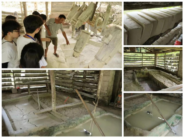 实践团非常幸运能找到传统水碓营造技艺代表性传承人詹和安师傅,在詹师傅的介绍下,队员们仔细观看了水碓的工作流程以及釉果制作的各个环节。首先瓷石经水堆的碓杆粉碎成细腻的釉粉,再将釉粉送至陶场的淘洗池淘洗,捞出泥浆中的杂质,泥浆再进入沉淀池沉淀,再进行稠化浓缩,倒入泥床,适当风干后,最后由詹师傅使用模具将其制成方形釉果块,一块釉果块足足有四斤重。在这工坊的四周摆满了詹师傅制作的釉果块,詹师傅强调,制作釉果是技术活也是体力活,要肯吃苦耐劳。
