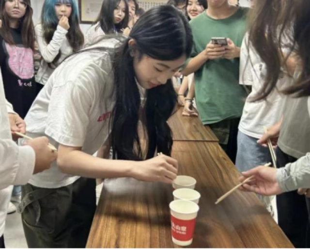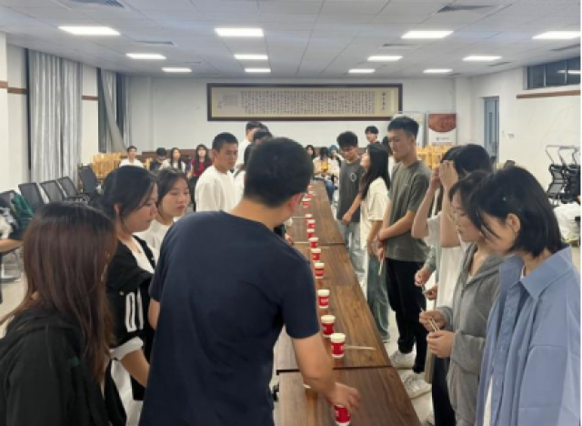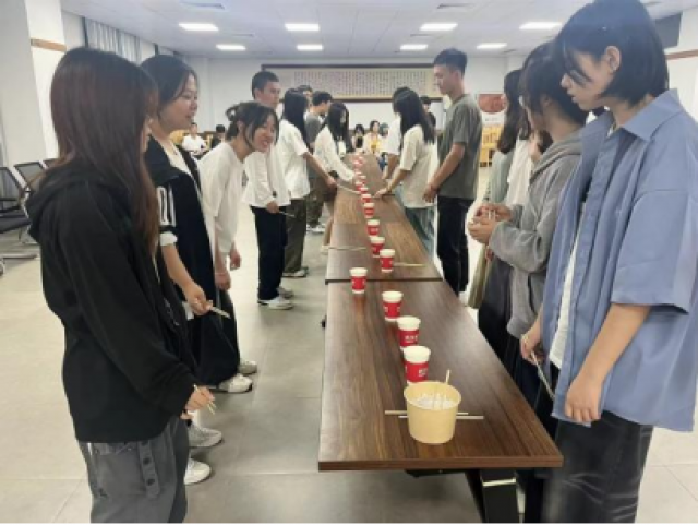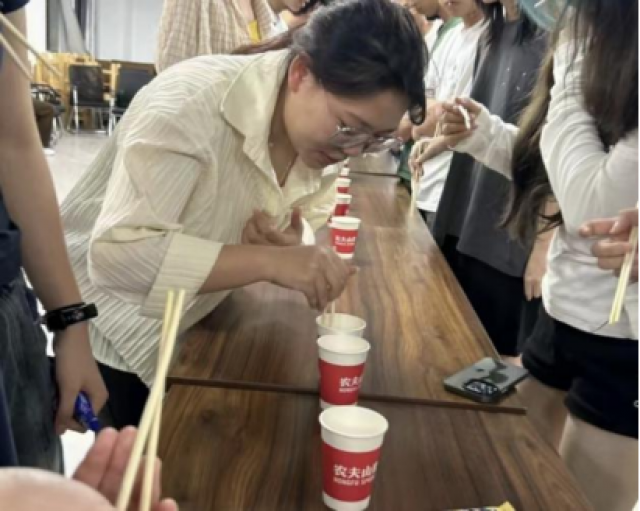 一团“星火”,默契合作,同学们从最开始的杯中夹出弹珠放入下一个杯中,接续进行,但任何一次掉落都将从头开始,这让大家意识到团队里的每个成员都是重要的,每一次成功夹取都将离成功更进一步,只有信任彼此,发出每个“星火”的光,才能在长长的传递中成功到达彼岸,路虽长,但情谊更长。