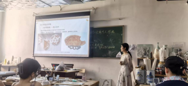 为促进师资队伍素质提升,全力帮助青年教师快速成长,带头开展“传帮带”工作,校国家级一流本科课程《陶瓷古彩装饰》课程,采取“老带新,传帮带”的形式授课。由方漫、程幸教授带领青年教师陈和杰、熊晨,通过强化课堂教学师生互动、生生互动环节,加强研究型、项目式学习,促使同学们掌握古彩的形成和发展脉络,以及各个时期古彩瓷的艺术特点。并进行实操示范,促进传统工艺传承。在课堂理论教学上让学生了解古彩这门学科的主要材料、工艺、制作方法、基本原料和颜色,尤其是古彩颜色的制备和应用。要求并掌握古彩设计及制作技法。以学生为中心,教师因材施教,打破课堂沉默让学生参与式学习、互动式学习,有效组织课堂教学。为鼓励学生亲近经典,远离低俗,加强中国文化传统教育,增加学生认识工艺美术观念、造型和审美特征,树立以中国文化为本、兼容外来艺术经验的学理立场;加强坚定文化自信教育,引导学生正确观察分析工艺美术专业艺术走向,树立“为中国造型、为中国设计”的专业意识。