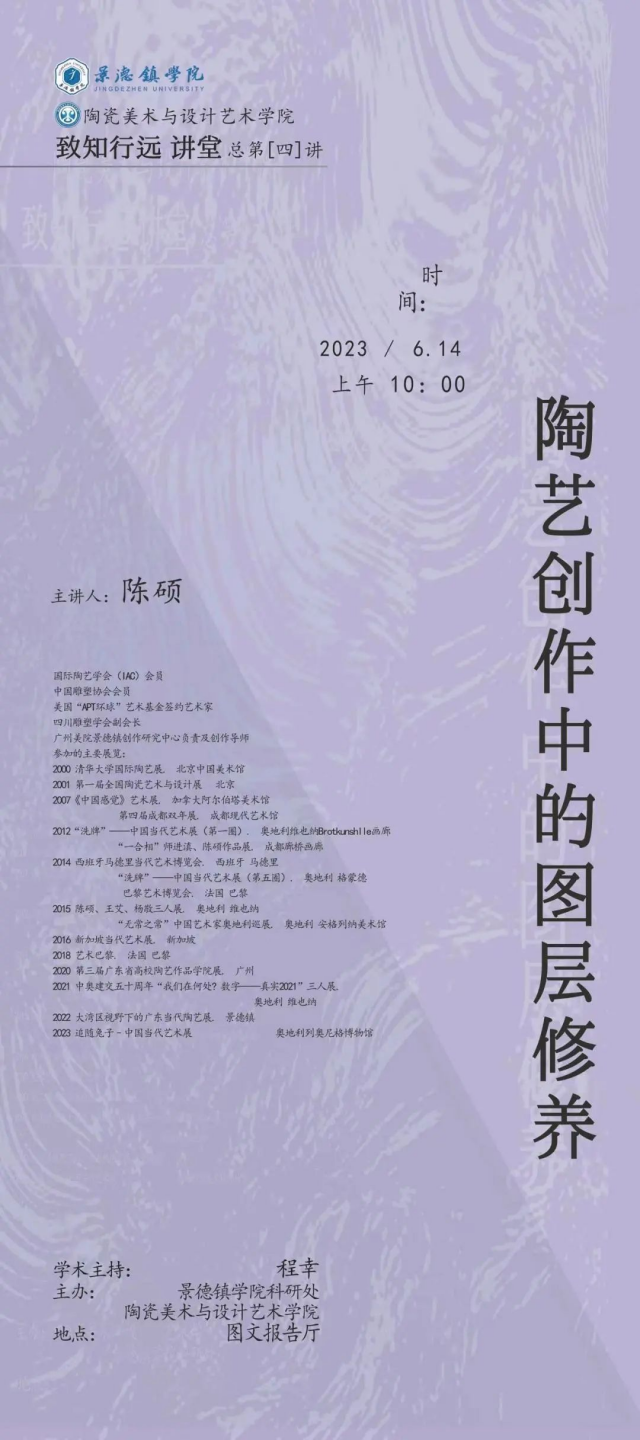 (本网讯:图文|陈瑗媛)6月14日上午,景德镇学院陶瓷美术与设计艺术学院举办了“致知行远系列讲座之《陶艺创作中的图层修养》”讲座。本次讲座由陈硕担任主讲人,艺术学院副院长程幸担任主持人。