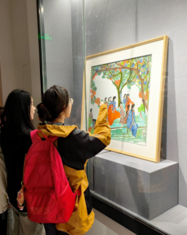 老师们热情讲解,同学们认真聆听。展览中的艺术作品类琳琅满目,装饰手法多样,题材内容丰富多彩,可谓各显特色、各具亮点、各有千秋。各类艺术作品积极呈现了各民族文化的时代价值,展现各族人民为民族团结进步事业和中国特色社会主义事业奉献青春、智慧和力量,充分突出了“中华民族一家亲,同心共筑中国梦”的展览主题。