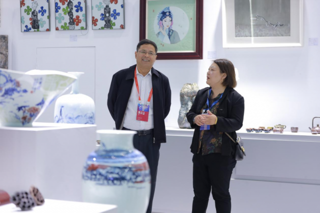 (本网讯:图|廖云峰 候晨昊 文|艾诗琪 陈瑗媛 孙梦钱)10月18日上午,第20届瓷博会在景德镇陶博城隆重开幕。我院依托联合国教科文组织“陶瓷文化保护与创新”教席平台,围绕景德镇国家陶瓷文化传承与创新实验区工作,承办了“景德镇学院第二届传承与创新成果展”亮相1号展厅,旨在向全社会大力弘扬和展示景德镇学院陶瓷美术与设计艺术学院优秀陶瓷艺术教育成果。我校党委书记叶观荣,校党委委员、副校长方漫到现场参观指导。展览吸引了景德镇市委副书记吴隽,民革景德镇市主委、景德镇市科学技术局局长王筱松,景德镇陶瓷大学党委书记李良智,江西陶瓷工艺美术职业技术学院党委书记甘国华,江西陶瓷工艺美术职业技术学院党委副书记、校长肖绚,江西陶瓷工艺美术职业技术学院党委常务副书记、副校长李雄德,景德镇艺术职业大学校长冯小苏等来宾驻足参观。