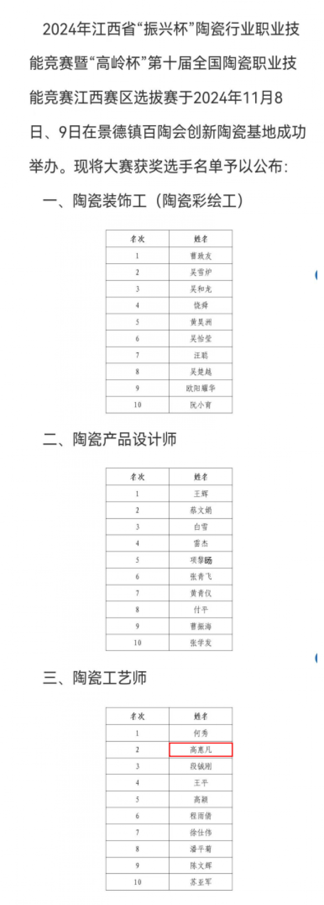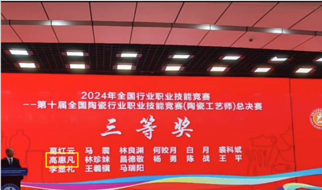 (本网讯:图片|张童陈飞曹振海 文字|曹振海)2024年江西省“振兴杯”陶瓷行业职业技能竞赛暨“高岭杯”第十届全国陶瓷职业技能竞赛江西赛区选拔赛于2024年11月8日、9日在景德镇百陶会创新陶瓷基地成功举办,我院教师高惠凡喜获陶瓷工艺师江西省赛第二名,并代表江西省参加全国总决赛。11月13日2024年全国行业职业技能竞赛(陶瓷工艺师)总决赛中,高惠凡老师喜获全国三等奖。