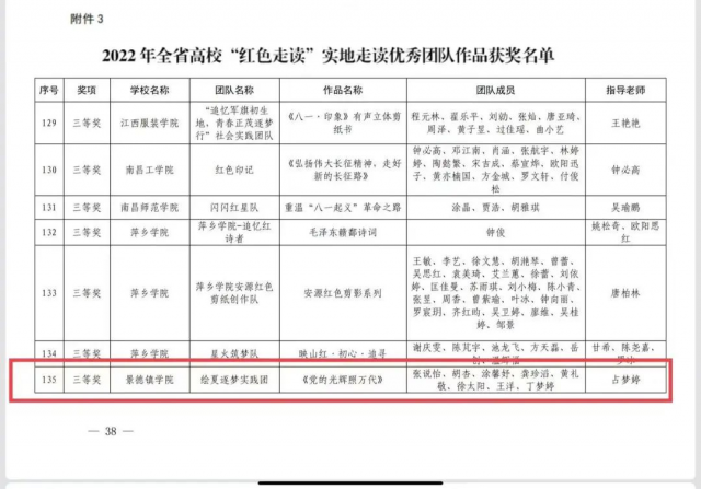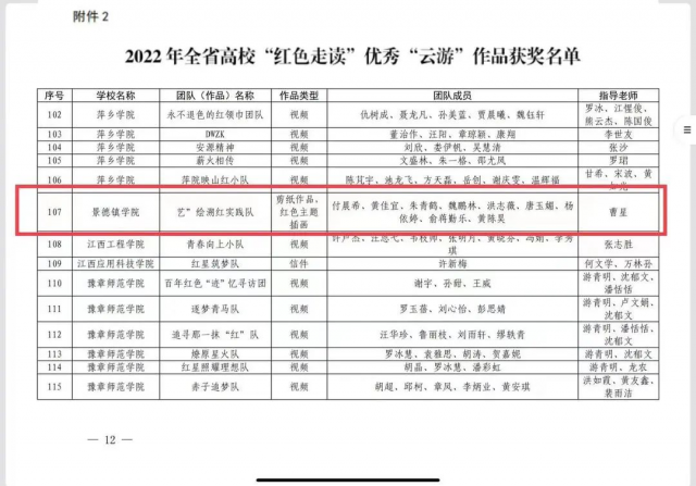(本网讯:图文|陈媛媛)近日,省委教育工委、省教育厅公布了2022年度“红色班级”创建、“红色走读”、红色动漫创作大赛获奖情况,获悉,景德镇学院陶瓷美术与设计艺术学院魏瑶瑶同学创作的 《寻找光明》漫面类作品获得红色动漫创作大赛一等奖,绘夏逐梦实践团队创作的《党的光辉照万代》 剪纸作品获得“红色走读”实地走读三等奖,“艺”绘溯红实践团创作的红色主题插画获得“红色走读”优秀“云游”作品,在此表示热烈祝贺!