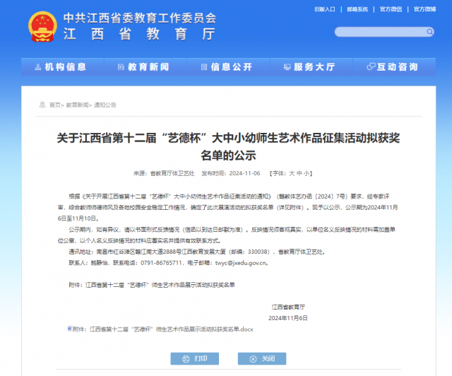 近日,江西省第十二届“艺德杯”大中小幼师生艺术作品征集活动拟获奖名单正式公示,景德镇学院师生在此次活动中取得佳绩。景德镇学院荣获“优秀组织奖”,展现了我校在艺术教育领域的卓越实力和组织能力。