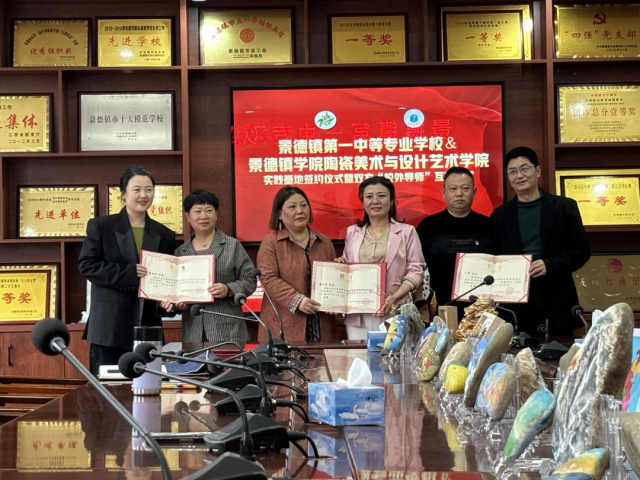 首先,双方就后期艺术教育系实践教学的深入合作进行了建设性的探讨,在美术学专业人才培养方案、教学模式的优化等方面发表了意见,为教育见习活动的开展做出积极的贡献。其次,两校就教育合作进行了教师互聘仪式。张博表示,通过互聘教师,不仅可以共享优质的教育资源,还能促进两校教师之间的交流与学习。这种合作模式将为师生提供更多元的学习平台和实践机会,进一步激发教育教学活力。最后,在景德镇市第一中等专业学校校长洪蕾等行政领导和教师代表的陪同下,调研小组依次参观了陶艺实训室、学生展厅、名师工作室及整个校园。参观过程中,张博详细询问了教学设施的配置情况,对学校提供的实习实训条件给予了高度评价。她特别强调,实践教学是培养学生创新能力和实际操作技能的重要环节,景德镇第一中专在这方面做得非常出色。