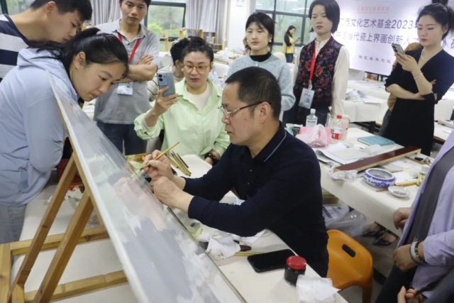 为了让学员们更好地理解和掌握新彩山水画的创作技巧,余天荣还进行了现场示范作画。他手中的毛笔在瓷盘上舞动,水墨与色彩交织出美丽的山水画面。在余天荣的巧手下,山石的硬朗、水流的柔美、云雾的缥缈都被表现得淋漓尽致,为学员们展示了新彩山水画创作的全过程。学员们纷纷围绕在余老师身边,认真观察、学习。余老师在作画过程中,不时与学员们交流心得,解答他们在创作过程中遇到的问题。