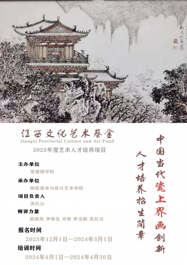 文化兴则国家兴,文化强则民族强。2023年10月7日至8日,全国宣传思想文化工作会议提出习近平文化思想,强调推动中华优秀传统文化创造性转化和创新性发展,党的二十大报告指出要推出更多优秀作品,培育人才队伍。在此背景下,江西文化艺术基金 2023 年度艺术人才培养项目《中国当代瓷上界画创新人才培养》应运而生,该项目以瓷上界画创新为目标,是全国第一个以瓷上界画为主题的省级艺术基金资助培训,对中国界画艺术传承传播以及瓷上界画创作创新有着重要意义。