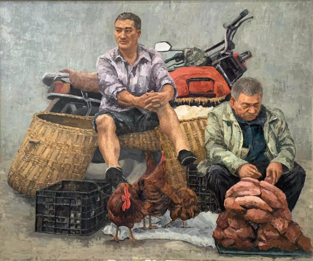 油画《市集---烟火乡村》,19美术学1班 朱玉红