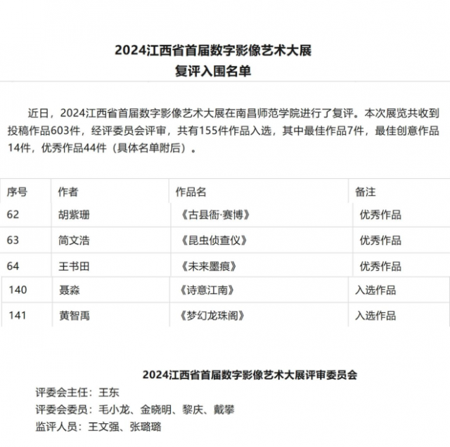据悉,本届数字影像艺术大展共收到投稿作品603件,经评委员会评审,共有155件作品入选,其中最佳作品7件,最佳创意作品14件,优秀作品44件。获奖作品将在南昌师范学院进行展览。