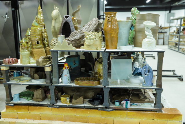 烧成实训室(釉下)主要完成陶瓷泥坯成型后的釉下烧成,包括吹釉、素烧、乐烧、气烧、盐烧、高温电烧等各类烧成实践教学。拥有吹釉机、各类气窑和高温电窑等实训设备。为学生熟悉陶瓷釉下烧成的各类方法积累丰富的实践经验,充分体验陶瓷烧制的乐趣。