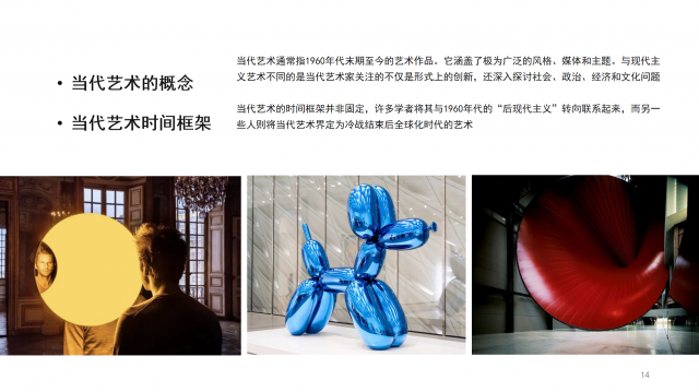 讲座对当下的流行艺术思潮和流派进行了深入剖析,如后现代主义、女性主义、生态艺术、数字人文主义等。探讨这些思潮产生的文化、哲学以及社会背景,分析其在艺术创作中的具体体现,以及对当代艺术发展方向上的影响。例如,生态艺术思潮下,艺术家如何通过作品呼吁环境保护,反思人类与自然之间的关系;数字人文主义思潮中,艺术与科技的融合产生了哪些新的创作形式与理念。当代艺术从时间上来界定,主要包括从现代主义时期结束后,20世纪下半叶,以及当今的艺术。从门类上来看,包含绘画、雕塑、摄影、装置、行为表演、录像等多种形式;也泛指具有“当代意识”或“当代形式”的艺术作品,借由艺术实验和作品形式,表达创作者的观念与思想,打破古典艺术中的审美局限。相关流派有波普艺术、观念艺术、大地艺术等。其源于二战后,现代主义向后现代主义过渡时期,在不同阶段下衍生出了多种流派,如20世纪六七十年代的波普、观念、行为艺术等,八九十年代的新表现主义、新媒体艺术等,具有全球性、文化多样性、社会介入性、技术相关性等特点,以创新形式和观念回应时代。