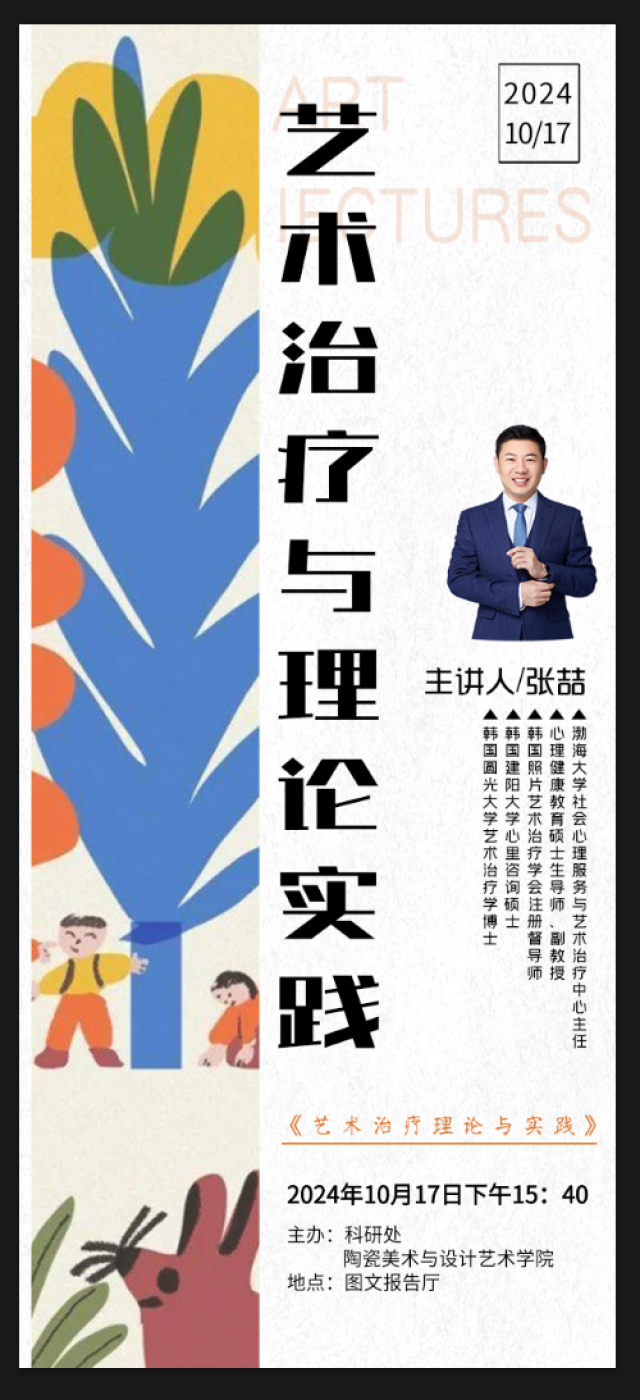 10月17日,景德镇学院陶瓷美术与设计艺术学院面向美术学及艺术教育师范类专业举办《艺术治疗理论与实践》的讲座,旨在加强艺术类师范专业的艺术疗愈课程体系与特色建设。本次讲座特别邀请了渤海大学社会心理服务与艺术治疗中心主任、副教授张喆担任主讲嘉宾,学院百余名师生到现场聆听学习。讲座由景德镇学院陶瓷美术与设计学院副院长朱希睿主持。