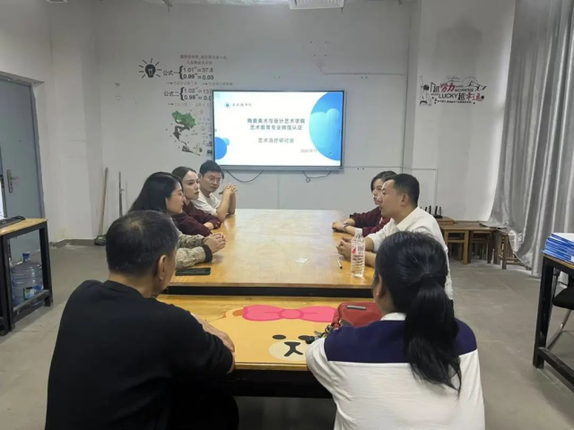 讲座结束后张喆博士、朱希睿副院长与部分艺术教育骨干教师针对艺术教育开展陶艺疗愈课程研讨会。在会上张喆博士对通过艺术教育专业人才培养方案课程设置,专业发展路径与方向的课程合理性分析,针对陶艺疗愈相关课程体系与课程开发提出相应调整意见。