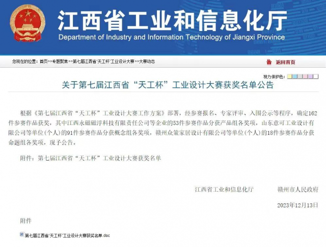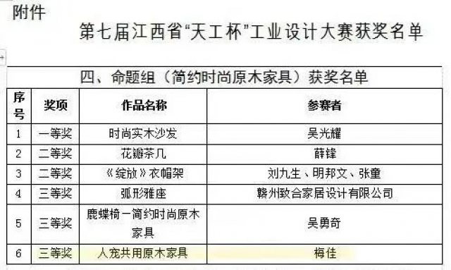 (本网讯:文|王思怡)近日,江西省工业和信息化厅、赣州市人民政府主办的第七届江西省“天工杯”工业设计大赛终评工作结束。由我院产品设计系教师唐姣指导的20级产品设计1班学生梅佳在比赛中,喜获“命题组(简约时尚原木家具)”三等奖,并获得2万元比赛奖金。