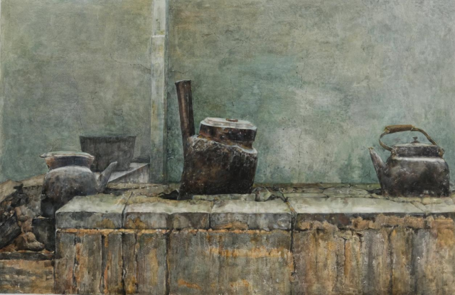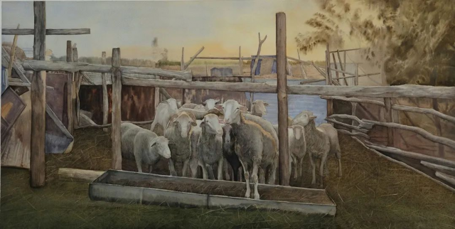 创作思路:作品取材与农家小院的一处不起眼的角落,在夕阳映射下,暖色的天空与地面产生强烈的冷暖反差,构成了整幅作品的画面基调。通过横、竖、远、近互相交错的围杆分割画面,以突出画面中的主体“羊群”,增强画面的形式美感。作品运用写实的传统水彩画技法,以“羊群”神态借喻现实生活中人的情感,画面中神态各异的羊群仿佛是在守望着,守望着家园或者远方……