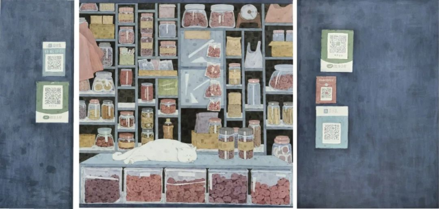 创作思路:记忆里路边的杂货铺售总有一只偷懒的大肥猫,里面卖的是商品,也是快乐,每个零食都是我们快乐的源泉。交错的线条是物体的造型,低饱和度的色彩是引人注目的丰富,平面化的稚气是记忆里的模样。