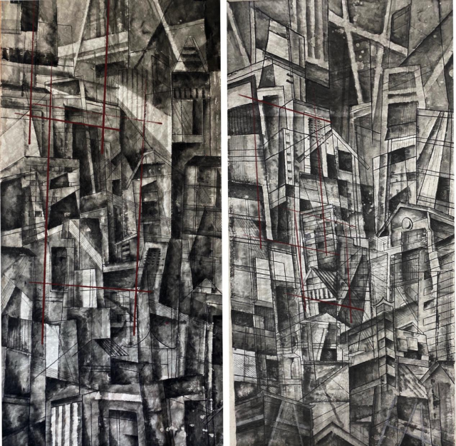 创作思路:根据本人家乡进行观察与创作,以城市山水为题材,在传统山水画之中融入现代元素,最后用红色线条处理整体关系。