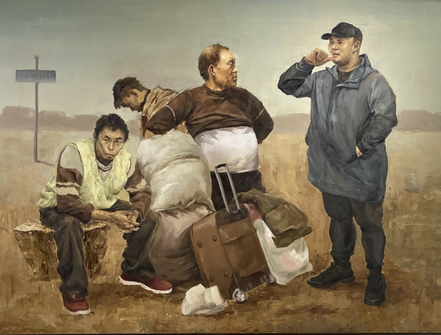 创作思路:疫情时代中,肆虐的新冠肺炎疫情,不仅危及各国人民生命安全和身体健康,还严重冲击世界经济。这让很多留在大城市奋斗的人们不得不重新做出选择,作品以西北黄土地戈壁滩上的一个车站为背景,回乡的人们在等车的途中,大家虽风尘仆仆,但精神饱满,有的坐石歇息,有的交谈甚欢。他们已经为自己回乡后的生活做好了充分的准备,并且依然对未来充满憧憬。