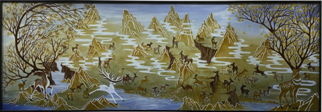 创作思路:灵感来源于“引狼逐鹿”的哲理故事,故事告诉我们人与自然,狼与鹿,鹿与周围环境本就是相互依存的关系,只有共处才能更好的维持自然界的生态平衡。因此我的毕业作品想要表达的思想是遵循自然规律。而鹿本就是一种寓意吉祥的动物,将其以釉上新彩装饰的形式呈现在陈设瓷板中可以更好的传承优秀传统文化。