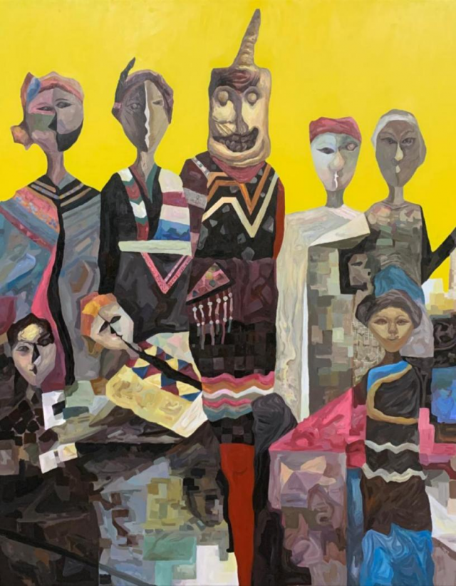 创作思路:以黎族文化为创作背景,展现黎族人文化特色。以黎族脸部纹身作为重要内容,黑色是代表着庄严和吉祥。部分红色黄色代表热情、活力、年轻的象征。中间人物主次明确,画面简洁单纯又具抽象之美,充分展现了黎族文身文化。综合创作这幅“开面”。