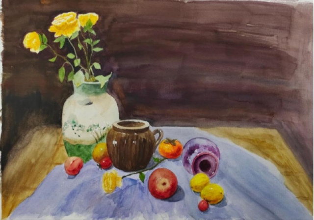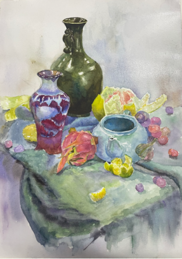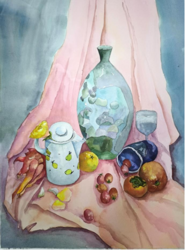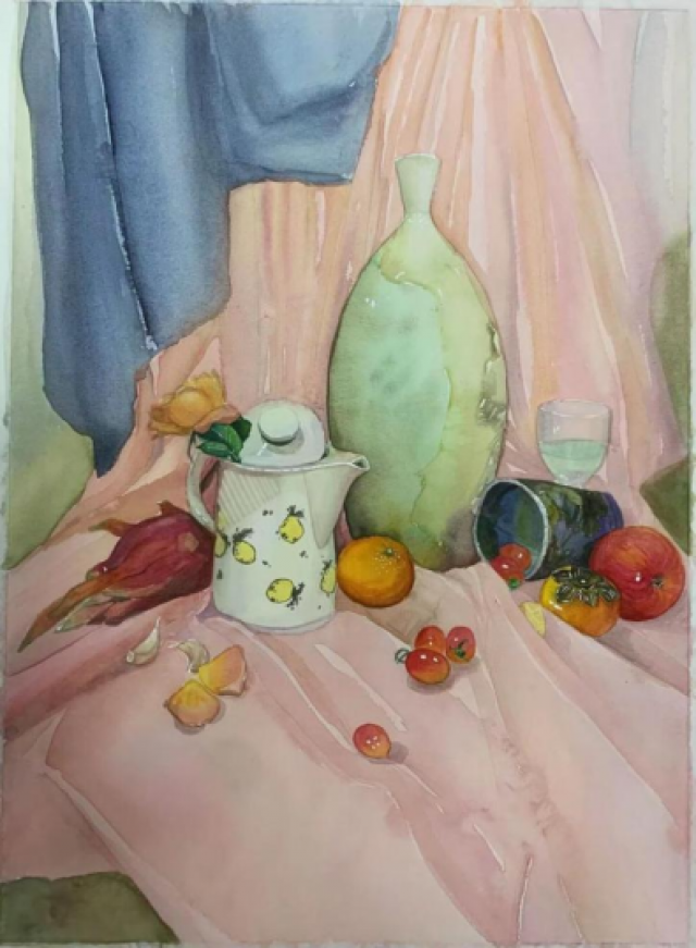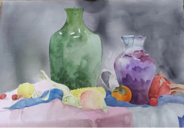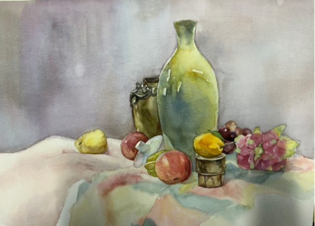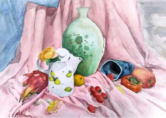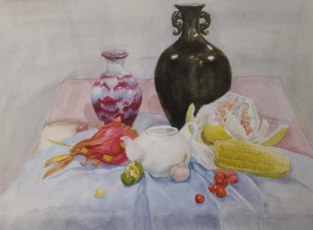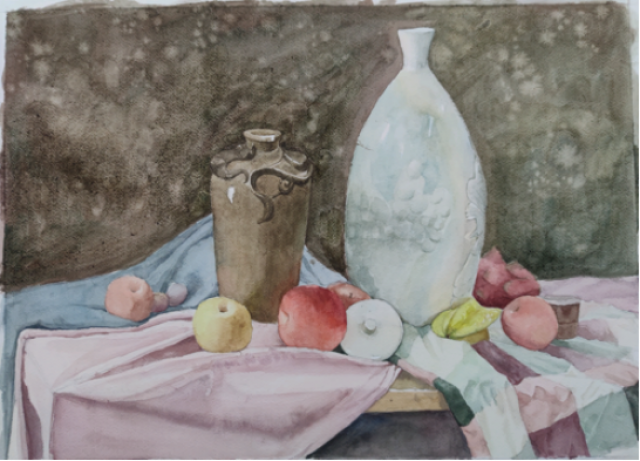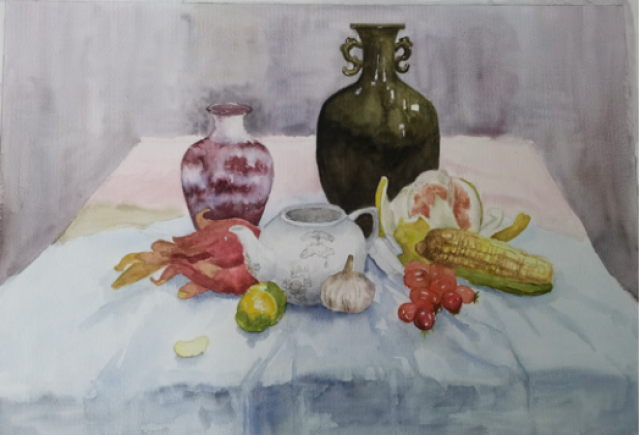 作品介绍:这副画是以水彩颜料为媒介在中粗水彩纸上进行绘画。结合写生与场景创作而成。画面描述在色彩斑斓的背景下,桌面上摆放着静物,背景以湿画法的渲染的方式绘制而成。画面中陶罐为视觉中心点,水果相衬,整个画面以素雅的色调为主。对主体物进行着重刻画,整张画运用干湿结合法,以湿画法为主要绘画形式,干画法用于细节刻画。