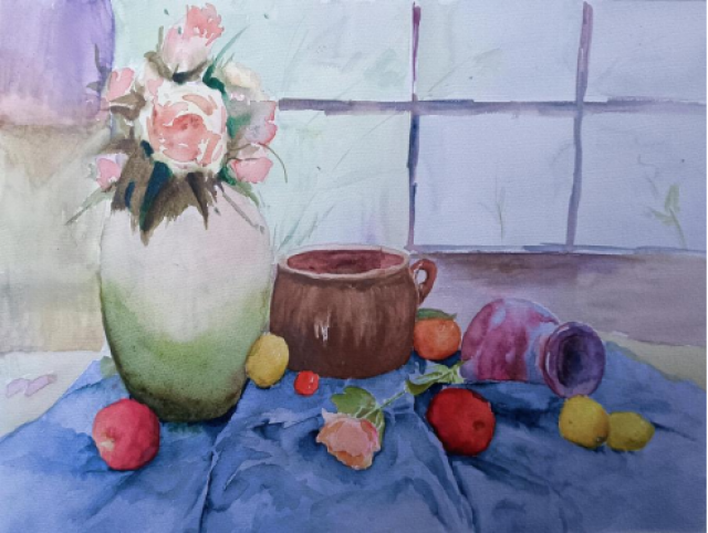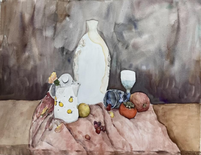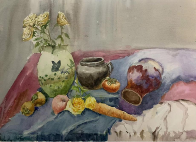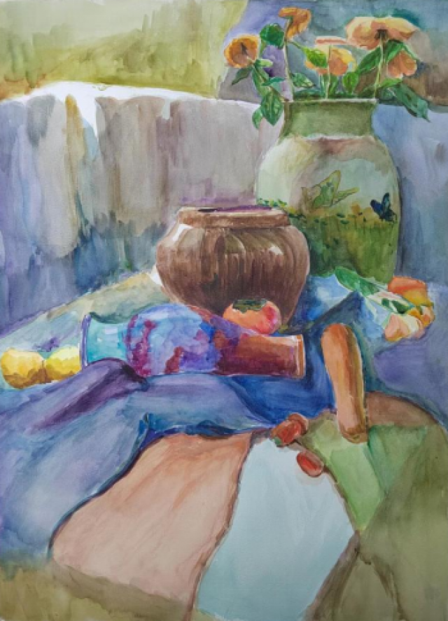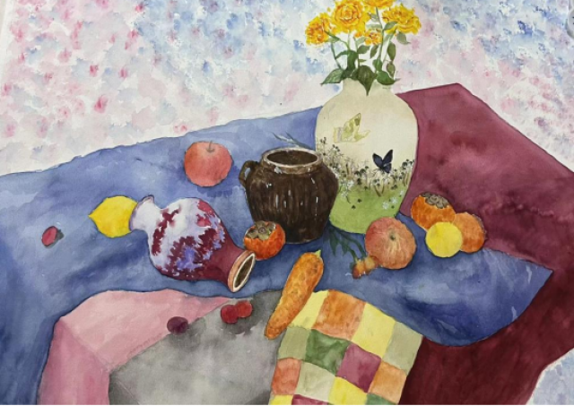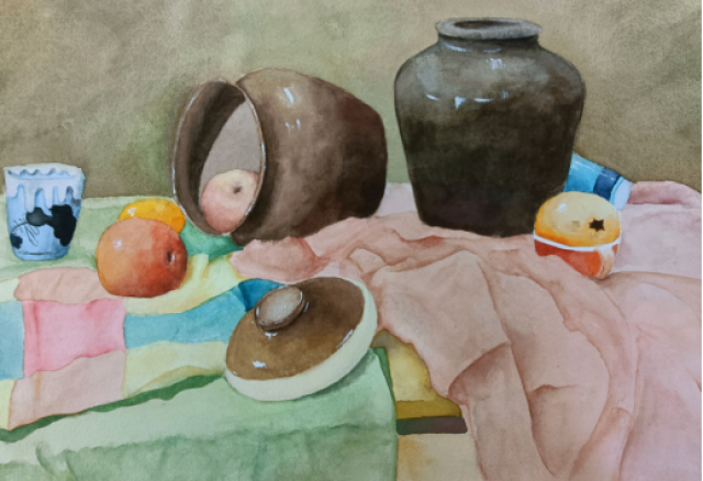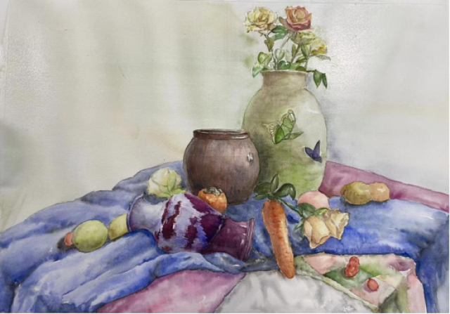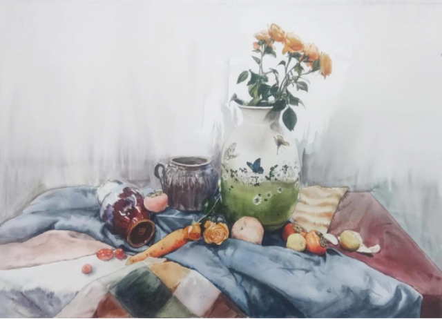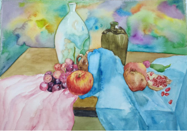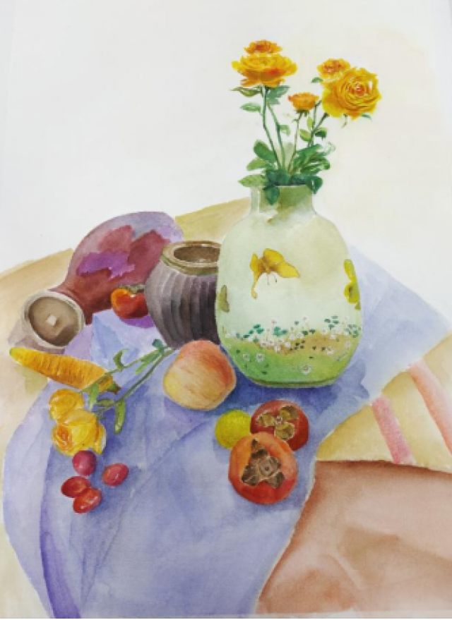 作品介绍:这副画是以水彩颜料为媒介在中粗水彩纸上进行绘画。结合写生与场景创作而成。画面描述在色彩斑斓的背景下,桌面上摆放着静物,背景以湿画法的渲染的方式绘制而成。画面中陶罐为视觉中心点,水果相衬,整个画面以素雅的色调为主。对主体物进行着重刻画,整张画运用干湿结合法,以湿画法为主要绘画形式,干画法用于细节刻画。