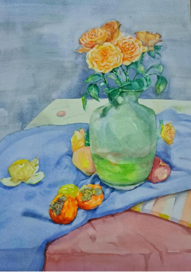 作品介绍:桌面上的月季和柿子构成一幅岁月静好的画面,秋日的最后一个节气,忽而晚秋,柿子的颜色一点点的从坚挺的带些绿色,到黄色,到橙色,可以观察到日子里流转变化的有意思,空间在时间里的成长。桌面上的月季,总让人在这平凡的日子里,有些欣喜的际遇,前面盛开的鲜花和后面枯萎的月季形成鲜明对比。冷色的衬布,和暖暖的柿子月季共同构成一幅和谐的画面,藏在罐子后的物体,像在躲猫猫的小朋友,让人一眼就爱上。同时,它们也蕴含着美好的寓意,柿柿如意,好柿即将发生,月季和罐子后的水果充满了青春的活力,生机勃勃,为四季展浓艳,吐芬芳。
