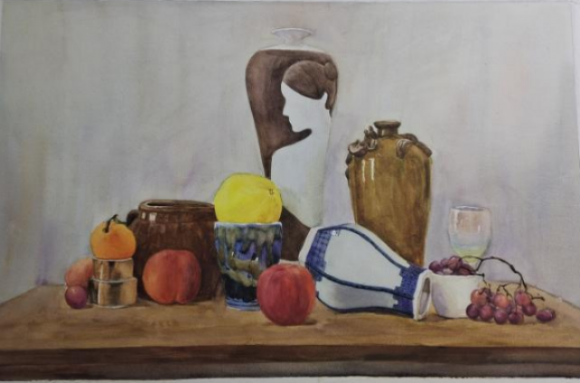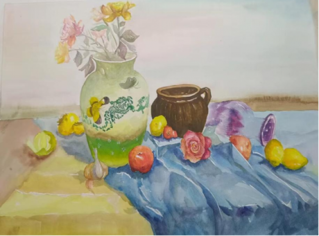 作品介绍:以水和颜料为媒介在纸上进行对静物的描绘。整体颜色氛围统一和谐,颜色不沉闷。构图不会有拥挤的感觉。物体塑造较完整,颜色明快,画面较轻松,作画步骤还有静物物体与水果造型严谨,前后虚实空间关系我也有表现明快。