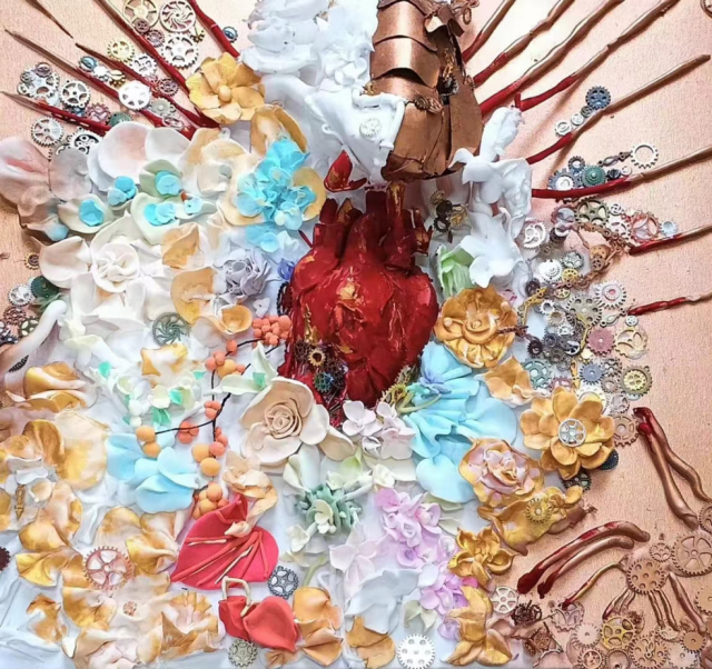 作品介绍; 以科技与艺术相交融的时代背景,探讨生命的深度和广度一场盛大生命的绽放,在金碧辉煌的璀璨背景之下,由齿轮机械提供动力将心脏的血液供向花朵,生命与机械的碰撞。不仅仅是生灵所令人羡慕的顽强力,开出朵朵铿锵玫瑰,机械高效运转的背后也是有各个生命所背负着,在追求资源的同时破坏了它。我们面对大自然,却种下齿轮的花朵,向它划下一道道伤痕。
