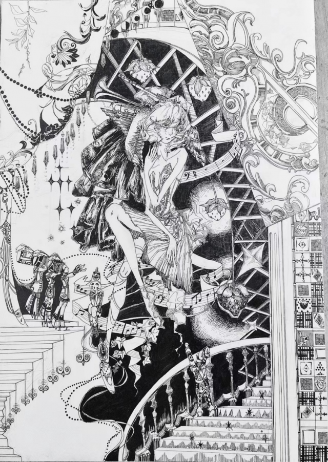 作品简介:揭开幕布的水晶帘下,胡桃夹子士兵们整齐排列,在舞台背景中隐隐散发着微光的草莓灯笼映亮芭蕾舞女恬静的侧脸。吹拂起的裙摆下交织着飘带和串珠,仿佛在诉说着一个个动人的故事。坠落星光下奏响的烂漫乐曲,俨然是一曲《欢乐颂》。