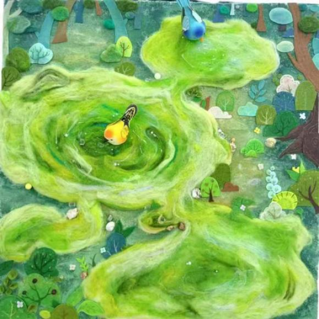 作品介绍:本作品以小鸟在水洼中洗澡的场景为灵感,水洼用大面积绿色的羊毛毡制作而成,使其从视觉上感受到朦胧柔软的立体效果,周边的深林则是用不织布裁剪而成,使整体风格更偏向于童话绘本。小鸟是灵动又可爱的生物,我希望通过这幅作品能让人们多注意到生活中有趣的小动物们。