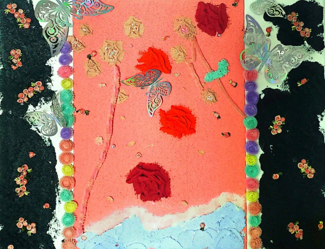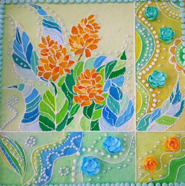 作品介绍:本作品采用了石英砂、丙烯颜料、珍珠、立体膏、粘土等制作而成。画面主要运用黄、蓝、绿等色彩搭配而成,浅色系色调给人一种舒适感,并采用花草元素,“春天”的感觉由此散发,使人感受到生机与活力