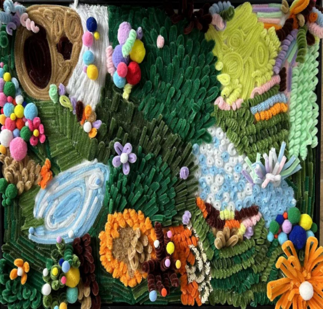 作品介绍:这幅作品名为《春日窗》,是由毛线作为基础工具,一针一线勾勒出的不同花朵,映衬出人们心中春天的象征,背景以颜料与石英砂混合,做出肌理感,增添作品氛围,百花齐放。作品整体用温暖鲜亮的颜色编织出春色满园的温馨氛围,传统钩针编织技艺与现代化绘画相互结合,别具一格。