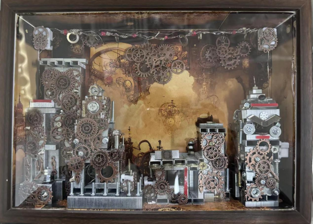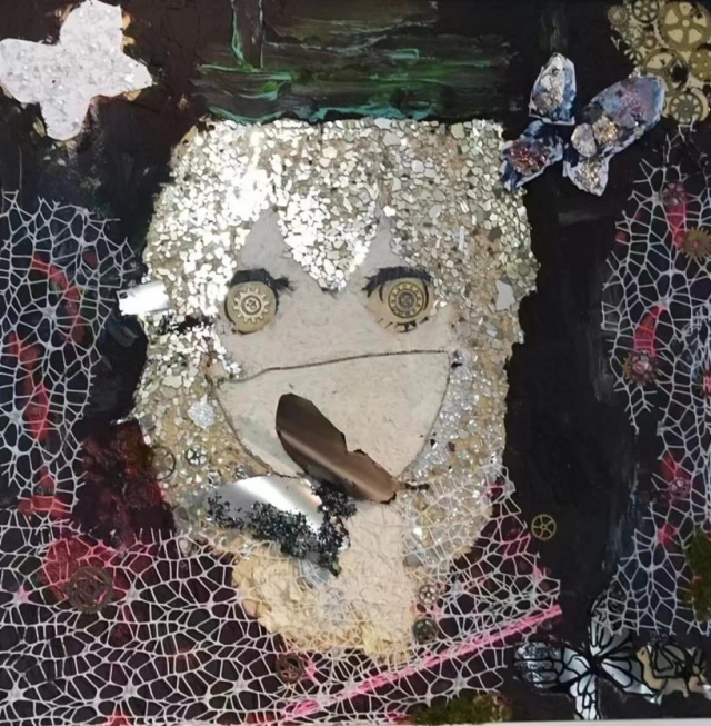 作品介绍:背景以黑色为主,画面主体为人物,将碎玻璃拼成人物头发,整个画面周边加上铁片及纸壳制成的蝴蝶进行点缀,用白网做肌理效果。铁片与齿轮为画面增加机械效果,对应“机”,中间立体的蝴蝶与周边苔藓饰品代表一定的“生命”,二者加在一起构成整个作品.