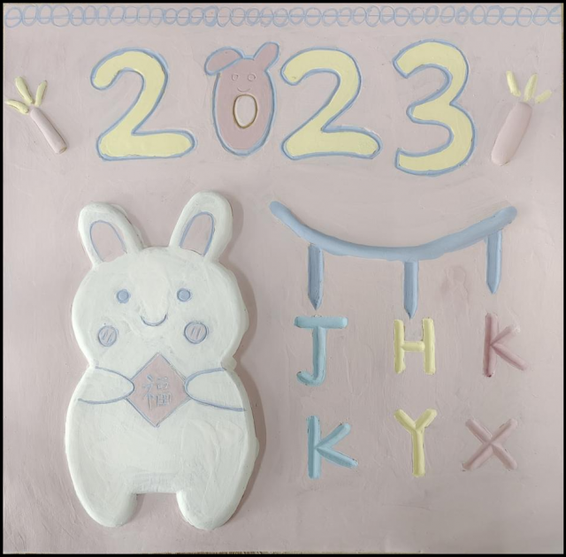 作品介绍:以即将到来的2023年为主题,兔子表示是因为2023年是十二生肖中的兔子年,图片中的字母表达了我在2023年的新年愿望,分别是健康,好运,开心。旁边是两个小爆竹表达了新年的喜庆。以粉色为背景,凸出白色兔子的可爱。该作品是陶瓷肌理语言的结课作业。通过刻画和堆贴两种形式来表达自己的感情,思想。兔子采用堆贴的方式能显得兔子更加的生动,有立体感。新年愿望则采取刻画的方式,和兔子的堆贴相对应,不至于显得画面单一。不一样的颜色使得画面更鲜艳,更彰显新年的喜庆。