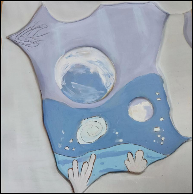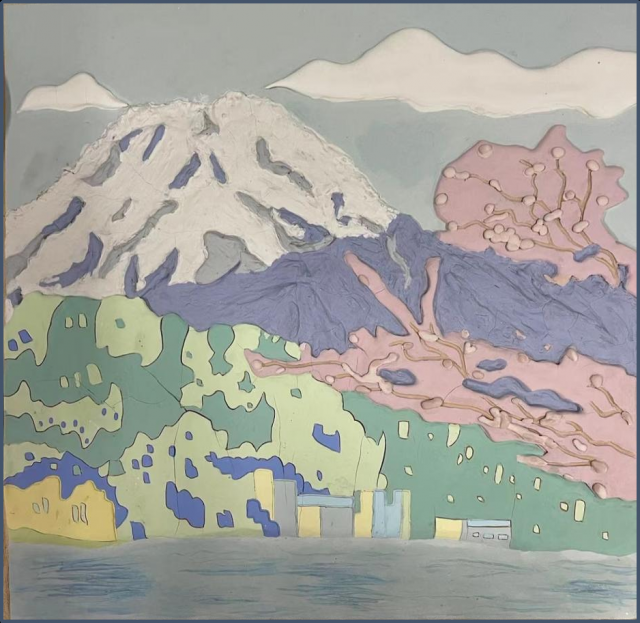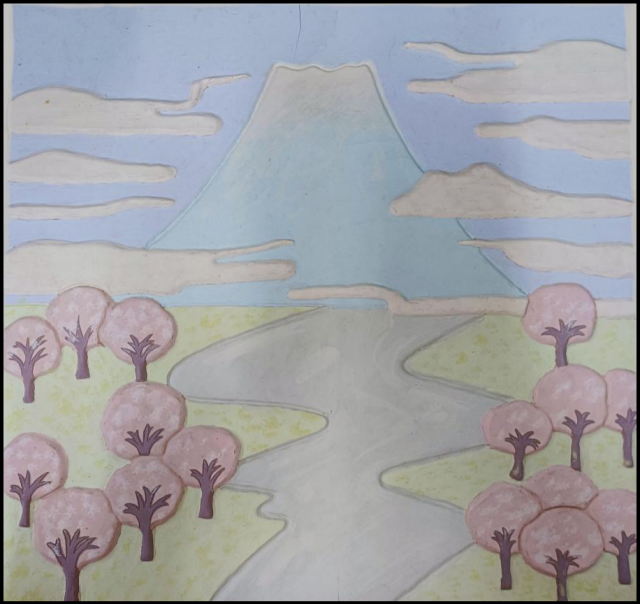 作品介绍:采用泥板堆贴刻画的方式进行创作,将云和樱花树进行堆贴,将富士山和河流进行刻画,营造远近高低各不同的视觉感,最后再进行上色。