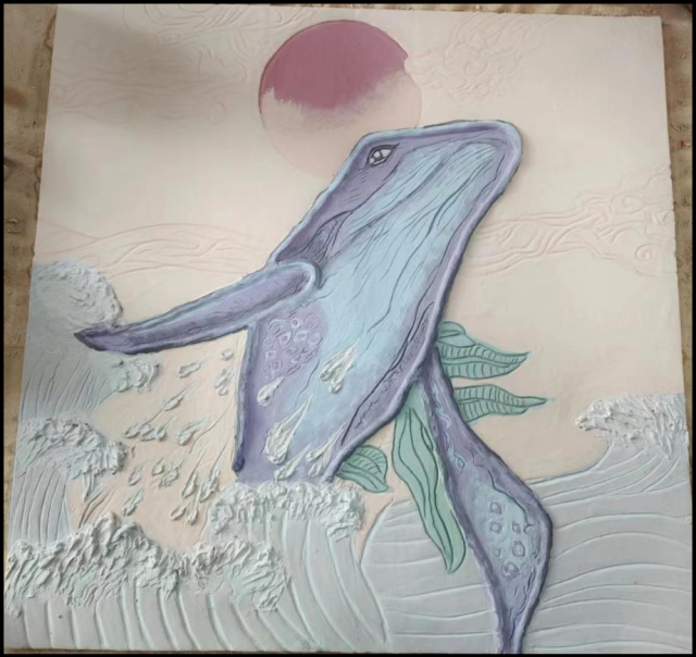 作品介绍:作品以跃海而出的鲸为主题,太阳天空为背景。整体采用浅色衬托深色的方法,突出主体。鲸鱼以黑色和深紫,天蓝色为主,背景使用灰色浅蓝。用堆贴的方式做出肌理,让画面更加立体生动,有层次。鲸鱼象征着自由,富有追求,生生不息。而画面上鲸鱼想要脱离海洋,向前跃进的形象,正符合了它向往自由的含义。