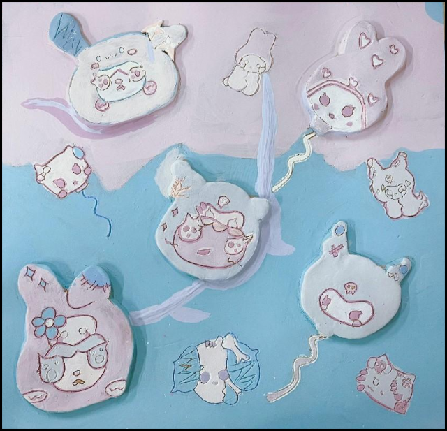 作品介绍:在擀好的泥板上通过堆贴,刻画肌理生动形象的营造出海绵宝宝与派大星,勾连起大家心底美好的儿时回忆。